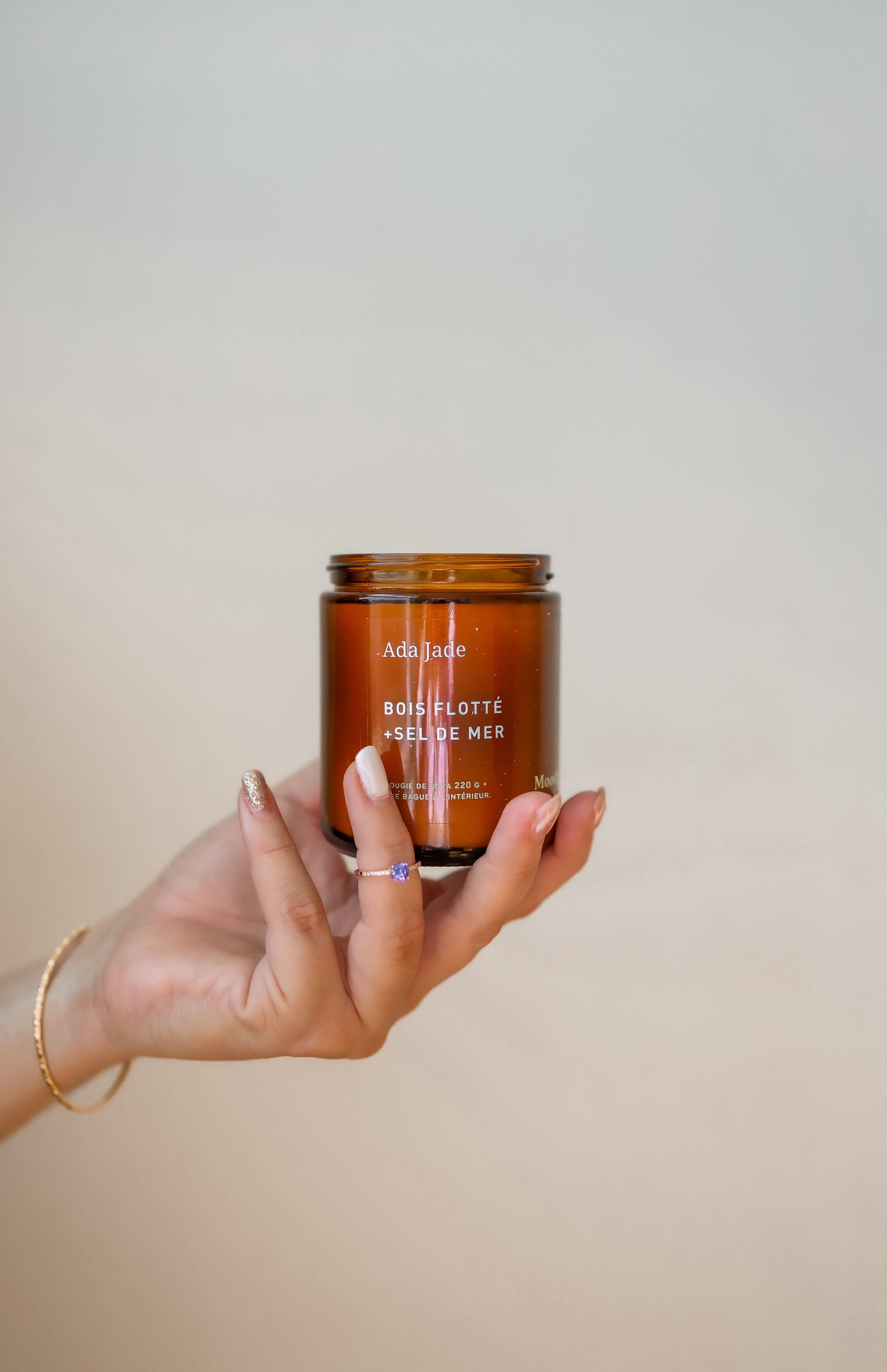 Made of 100% natural soy wax and offered in a reusable container you will find a handmade bracelet of semi-precious stones inside.